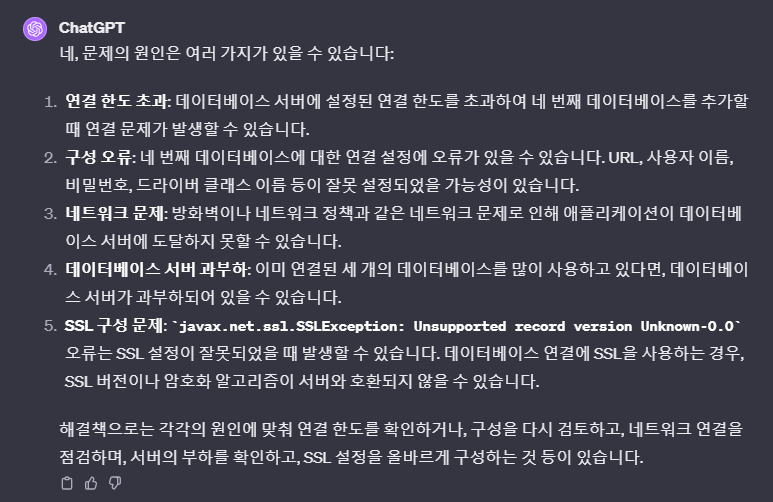 다중 db 를 연결하는 스프링 부트 프로젝트인데 db 정보를 3 개까지 연결할 때는 아무런 이상 없이 잘 도착했습니다.