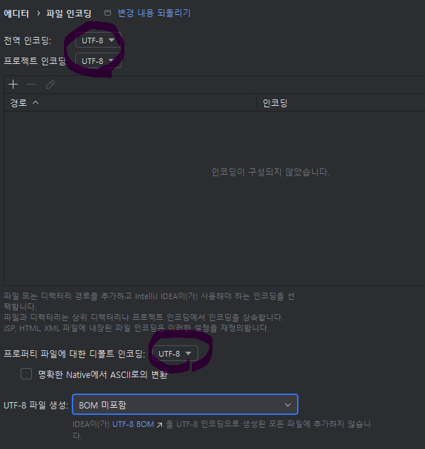 설정 > 에디터 > 파일 인코딩에서 모든 옵션을 UTF-8로 바꿔줌.