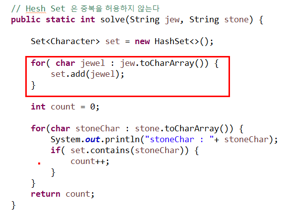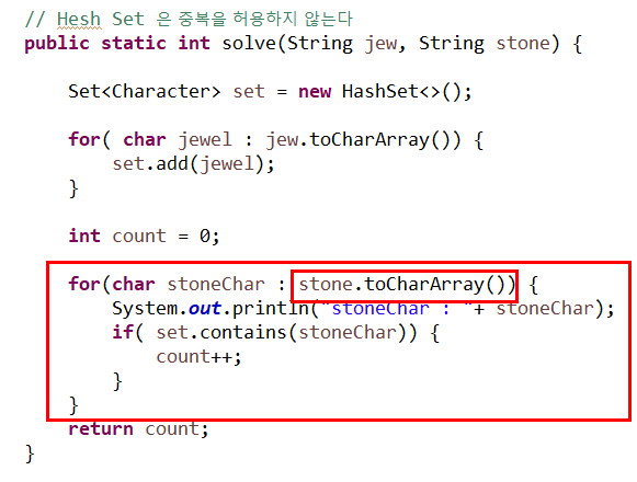 for(char stoneChar : stone.toCharArray()) {