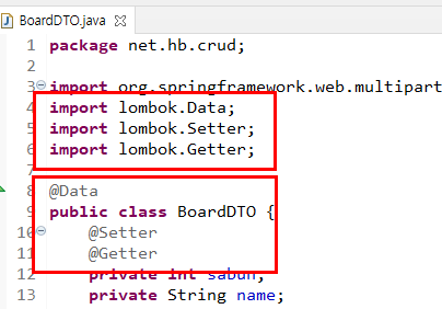 @Data 와 @Getter @Setter 을 적음으로써 Getter Setter 의 역활을 수행한다.