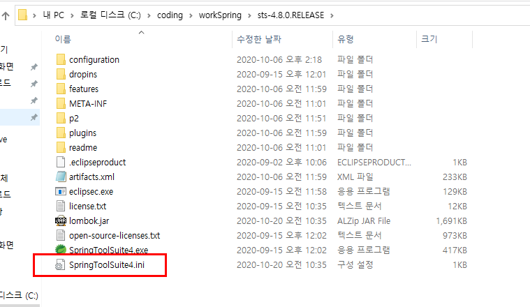 4. sts-4.8.0.RELEASE 폴더 안에 SpringToolSuite4.ini 이 생성됬는지 확인