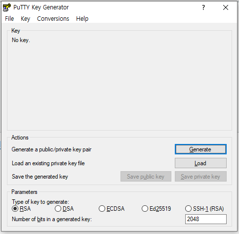 putty에서 aws 의 Key Pair를 사용하려면 Putty에서 사용 가능한 형식으로 변경이 필요하다. Puttygen 을 열어보자.